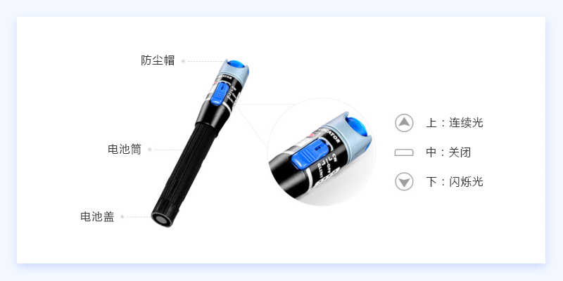 红光笔又叫光纤故障测试笔,主要用来检测光纤的连通性。飞速(FS)的红光笔采用二级体设计,可在10公里内检测光纤断裂或弯曲等故障,同时也可进行光衰减器、光源的校准,有恒亮和闪烁两种模式,恒亮模式可以稳定呈现光纤连通状况,闪烁模式可以快速查觉光纤断点位置。